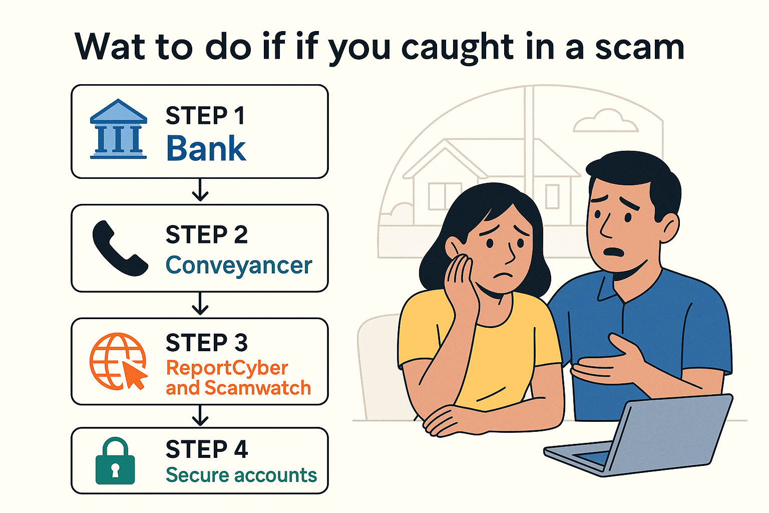 Your first move is to contact your bank immediately. Tell the bank you believe you have been part of a property settlement scam and ask them to try to freeze or recall the payment. Many banks have specialist teams for scams Australia wide and can act quickly if they get the alert in time. Next, contact your conveyancer or solicitor so they can document what has happened and support any follow up. They may also warn other parties in case the scammer is still active in the email chain.