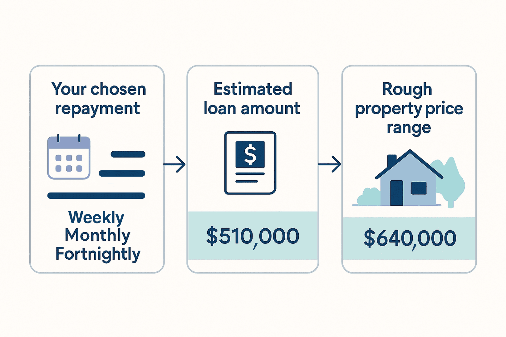 Here is the simple idea. When you enter a repayment, the calculator asks, "What size loan would create this repayment at the given rate and term?" If you tell it you can handle $3,000 a month at 5.8 percent over 30 years, the calculator might estimate a loan of around $510,000. If you also say you have a 20 percent deposit, it will show a property price near $640,000. Change the repayment to $2,500 a month and the estimated loan and price adjust down. Switch to a fortnightly repayment and you will see how that pattern plays out in smaller, more frequent payments.
