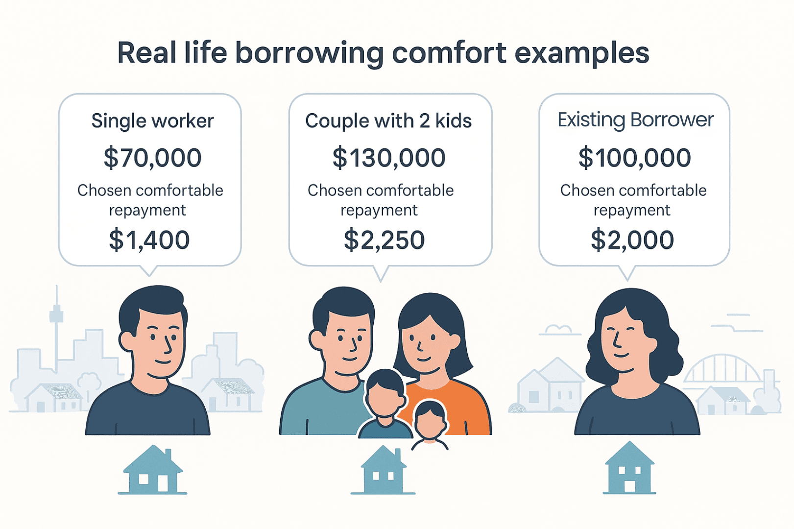 Sometimes examples make things click. Here are a few simple Australian scenarios that show how comfort, income and repayments work together. These are not rules. They are stories to help you picture how Craggle's calculator can support clearer choices.