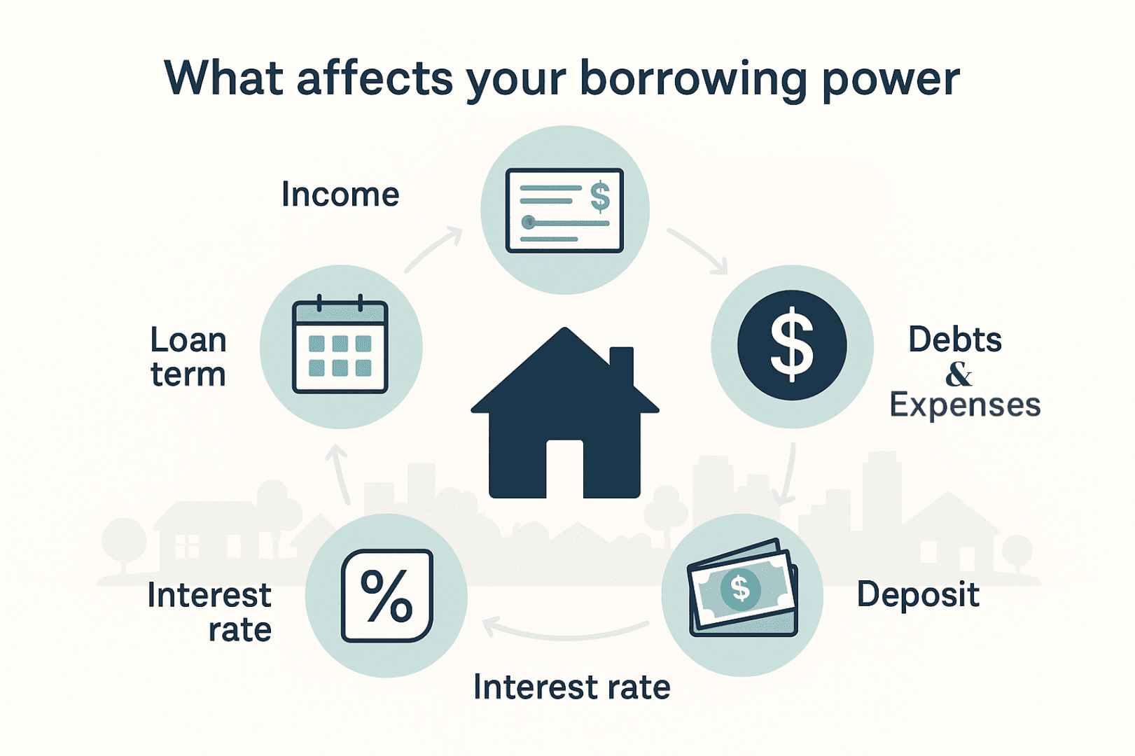 Your borrowing power is not just about income. Lenders look at a mix of factors to decide how much they are comfortable lending. The main ones are income, living expenses, debts, deposit, interest rate and loan term. Together, they shape your lending capacity and the level of mortgage borrowing a bank thinks you can manage.